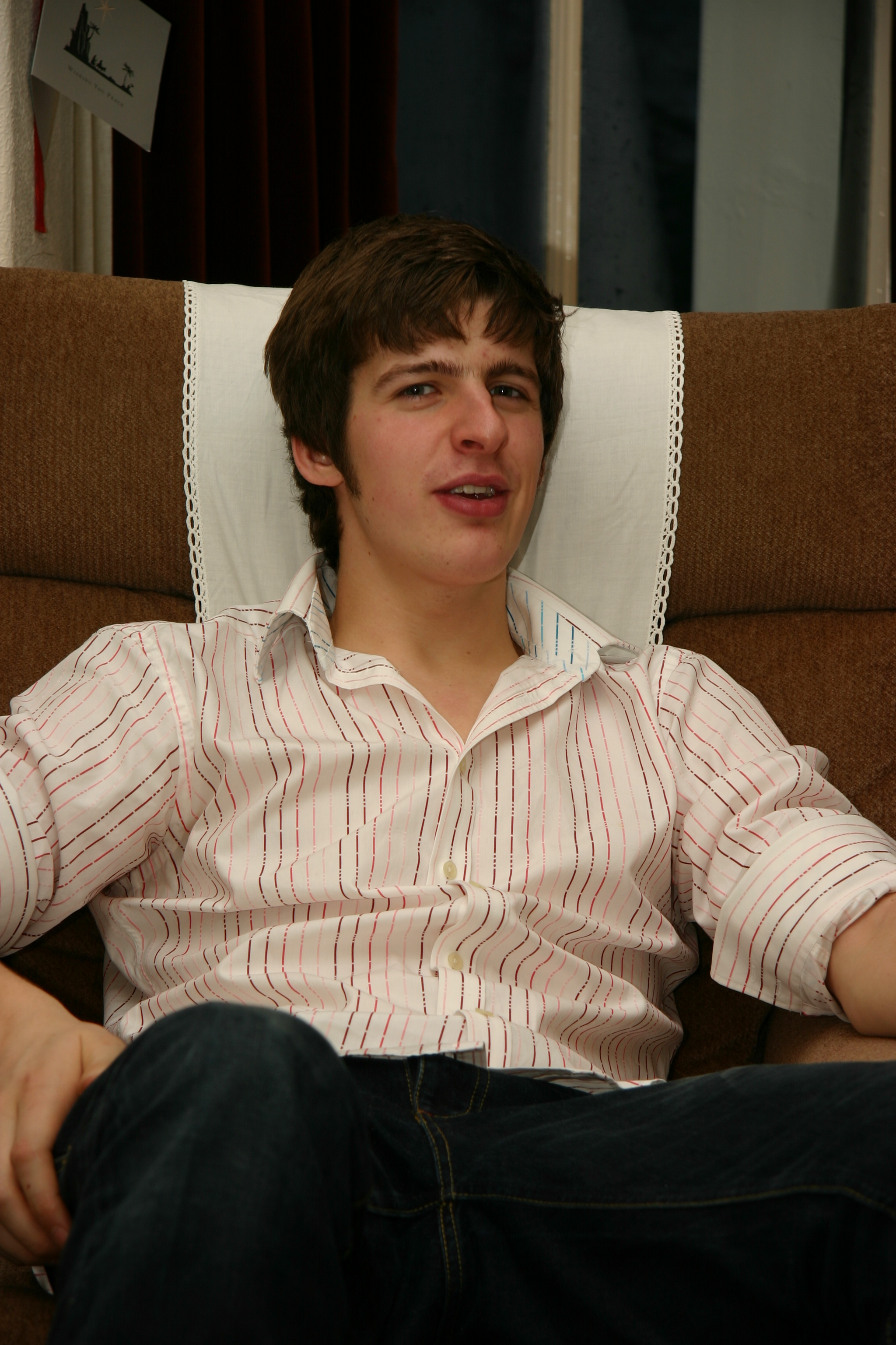 My brother, Sam Date/Time: Dec 26, 2006 15:27:00 Looking somewhat peeved at the photographer interrupting his nattering about uni life with Nicola.